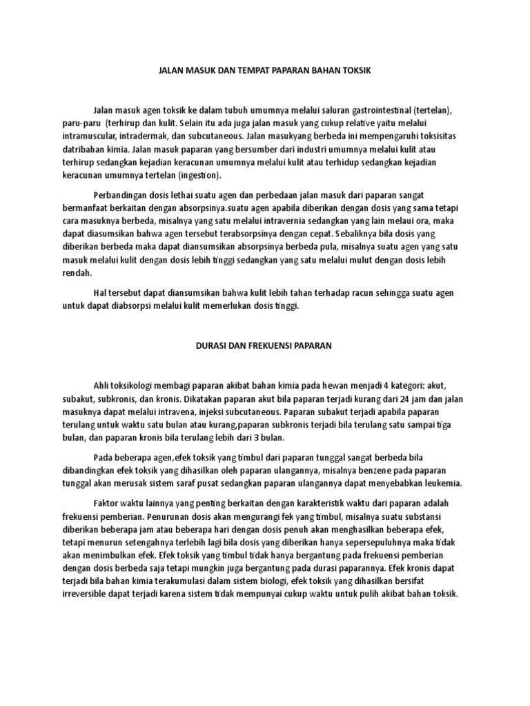Bahan paparan yang berasal dari industri biasanya masuk ke dalam tubuh melalui kulit dan terhirup, sedangkan kejadian keracunan biasanya melalui proses tertelan. · zat yang dalam dosis yang kecil dapat menimbulkan c. Kejadian pencemaran sisa bahan kimia yang menjejaskan kesihatan lebih 2,000 orang awam dan menyebabkan 111 sekolah di pasir gudang diarah ditutup dipercayai susulan pembuangan sisa toksik di sungai kim kim, pada 7 mac. Sifat yang khas dan tidak dimiliki oleh zat lain. Menyebabkan pencemaran air sisa yang mereput menghasilkan gas yang sangat busuk sisa kimia menjadikan air tidak sesuai untuk hidupan akuatik.