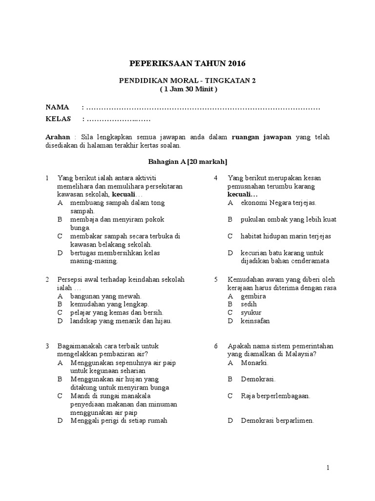 Latihan pendidikan moral tingkatan 2 jawab semua soalan.