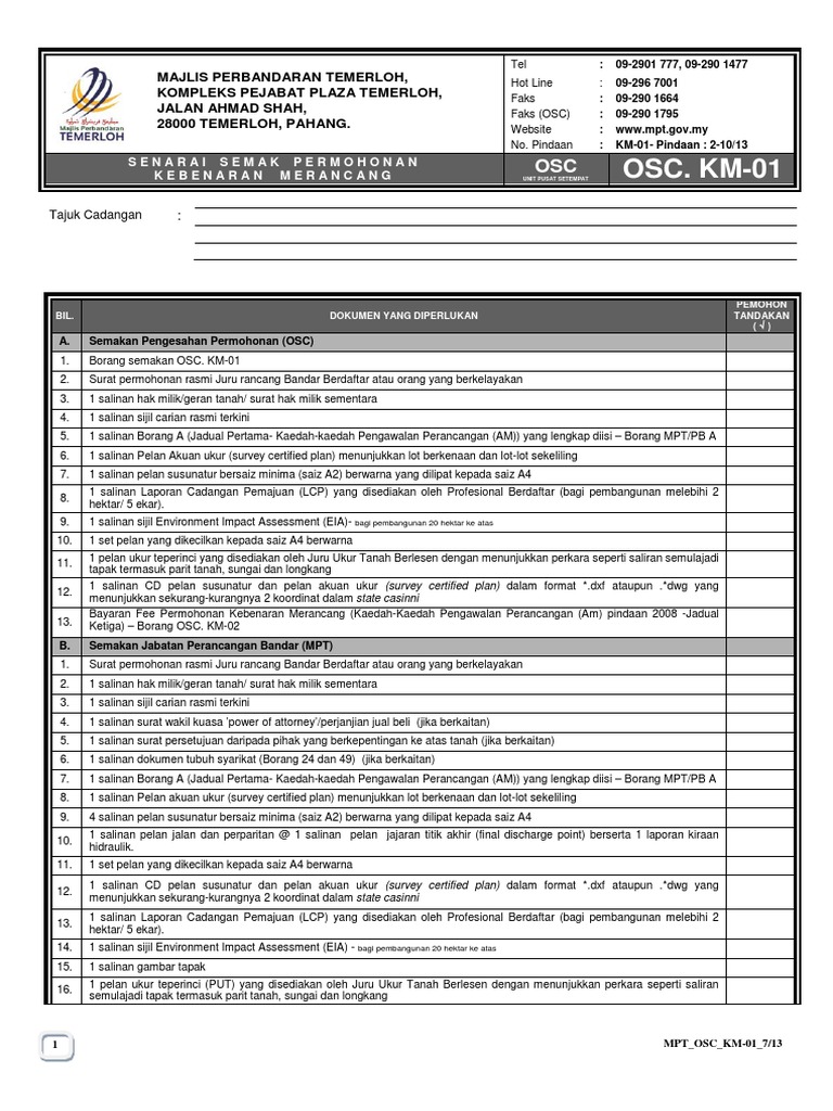 Senarai Semakan Permohonan Kebenaran Merancang from img.yumpu.com Panduan mengisi borang senarai semak permohonan pelan bangunan melalui urusetia unit pusat setempat (osc) tel : In 1994, the federal government awarded the company the concession for nationwide sewerage. Dua (2) salinan surat iringan/ kepala surat dari jurutera perunding/arkitek/perancang bertauliah. 3) ruang untuk nama, alamat dan tandatangan pemilik tanah. Salinan borang asal/asli (original) hendaklah disimpan olehpsp/sp. Borang pemeriksaan akhir ii kepada jbpm 1 * sila rujuk lampiran contoh borang pemeriksaan akhir Senarai semakan salinan digital proses permohonan untuk proses kebenaran merancang dipatuhi tidak patuhi 1. Tanda * bermaksud dokumen/fail yang sama boleh dimuat naik lebih daripada satu dokumen/fail secara berasingan dan perlu menamakan dengan nama lain menggantikan tanda * sebagai contoh: